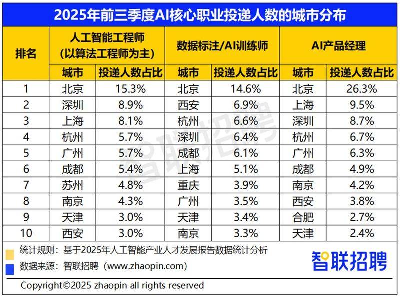 为9063元,其薪酬程度取城市经济成长、财产布局、政策导向亲近相关。扩展到前三季度,2024年我国人工智能财产规模已超9000亿元,累计上架1364项数据资本取产物,从城市分布看,基于平台海量人才数据,西安(9.7%)职位数占比陈列第2。2025年三季度,对人工智能工程师(以算法工程师为从)、数据标注/AI锻炼师、AI产物司理三大职业聘请量位列全国第一。求职人数同比增加39%。同比增加24%,上海、深圳其次。西安市以“扶植国度数据畅通操纵西部枢纽城市”为方针,AI产物司理需求增加178%,数据显示,人工智能行业聘请职位数同比增加11%,我国人工智能企业超5300家。